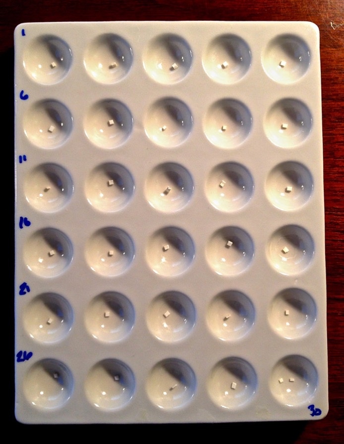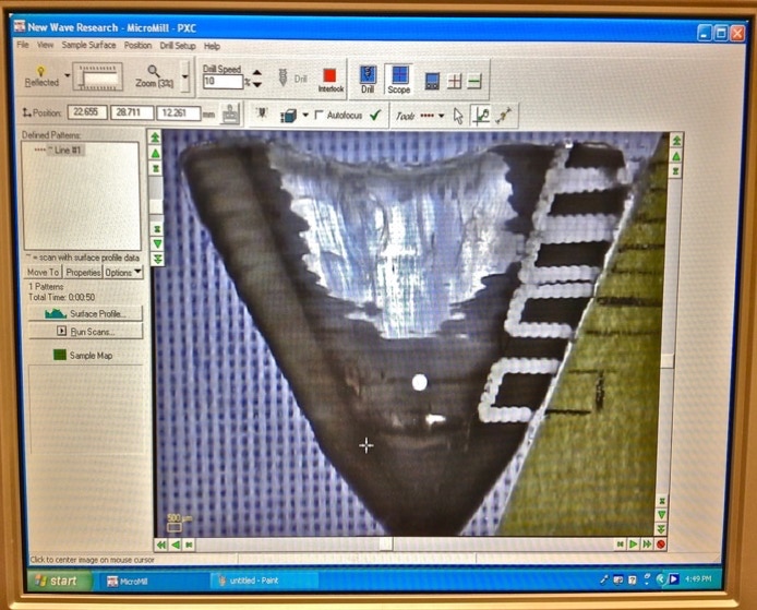 Above is a view of the computer screen during a micromilling extraction series. Pictured is a vertebra section that has been sampled by isolating small age specific samples from the vertebra. Youngest to oldest shark age (bottom to top on right) were sampled (n = 5) for radiocarbon analysis. Each of this small blocks were separated from the vertebra and cleaned prior to analysis at Woods Hole Oceanographic Institute. Below is a spot plate with 30 clean samples. All extractions were performed with New Wave Research micromilling machine (Elemental Scientific Lasers, Bozeman, MT, USA; http://www.nwrlasers.com/milling/micromill/).