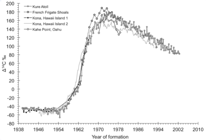 The new Kure Atoll coral ∆14C record with other coral records from across the Hawaiian Archipelago. The closest coral ∆14C records were from French Frigate Shoals, Oahu, and Kona, Hawaii Island. Note the strong similarities, as well as the minor differences, in timing and amplitude. These records tell a story... see published paper with the journal RADIOCARBON.