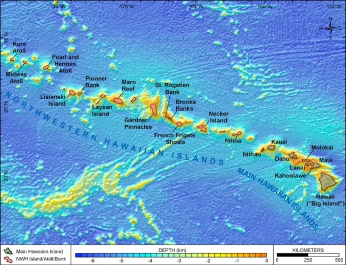 Islands and bathymetry of the Hawaiian Archipelago made by SOEST at University of Hawaii at Manoa. The study used the new core from Kure Atoll at the far upper left and coral records from French Frigate Shoals and Big Island.
